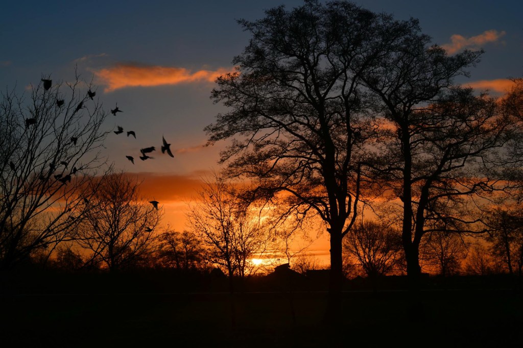 Gradually we move out of the trees towards open water meadows into the sunset. As we go, you’ll notice a change in the ambience which is heralded by the rhythmic sounds of a wire fence and the closing of a metal gate.